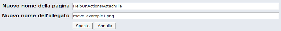 Ora è possibile rinominare il file (mantenendolo allegato alla pagina attuale) oppure spostarlo in un'altra pagina (e perfino rinominarlo, se desiderato). È comunque necessario il permesso write sulla pagina in cui si vuole spostare il file (e deve essere una pagina esistente).